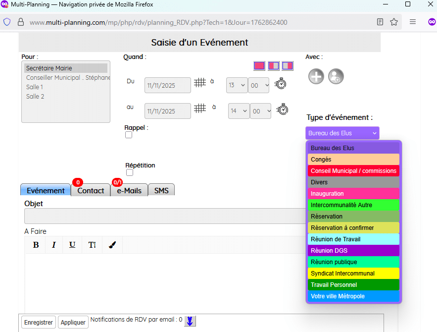 Multi-Planning permet une gestion des contacts. Chacune des fiches contact (dans cet exemple, la fiche de « Dupond Jean ») peut être paramétrée en ajoutant ou en cachant des champs pour être personnalisée selon les besoins.
